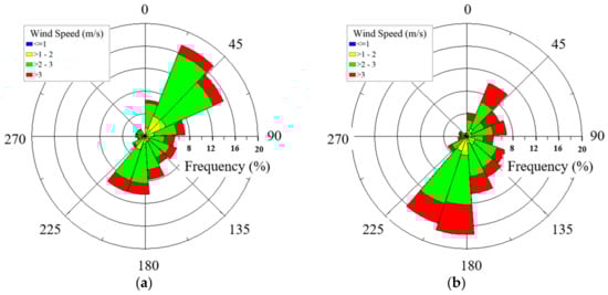 It can be noted that most of the wind speeds were in the range of 1–4 m/s, and 95% of the total winds were below 6 m/s, regardless of the season. Relatively lower magnitudes of wind speeds were observed during the winter and the summer as compared to other seasons. The most frequently occurring wind speeds were 2 m/s in the winter and the summer and 3 m/s in the spring and the autumn.