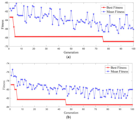 As shown in Figure 2, the genetic operations consist of selection, crossover, and mutation. In order to accelerate the convergence of algorithm, the best chromosomes (According to Equation (3), the smaller the fitness is, the better the chromosome is) of the older generation will be reserved and incorporated into the child generation.