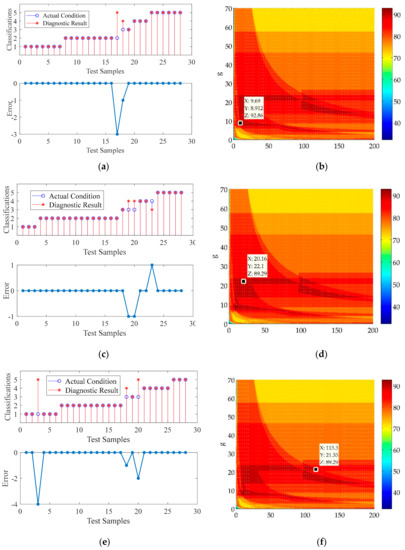 Figure 11 illustrates the relationship between C, g, and diagnostic accuracy with a Cartesian coordinate system in three dimensions, in which the X-axis, Y-axis, and Z-axis represent C, g and diagnostic accuracy, respectively. The larger the value of Z-axis, the higher the accuracy is (i.e., the deeper the red (blue) color is, the higher (lower) the accuracy of diagnosis is). From Figure 11 we can tell that the values of SVM parameters can significantly influence the accuracy of fault diagnosis. For example, the accuracy can be very low when (C, g) is near the origin (0, 0), but very high when (C, g) near the origin (10, 9). In addition, there were no specific laws can be summed up between SVM parameters and diagnostic accuracy, though there might be a general trend of “step up and then down” along the diagonal line from the origin. Therefore, the optimization for SVM parameters is necessary to obtain a better performance of classification of faults. Such an irregular distribution is a great test of the optimization performance of the algorithm.