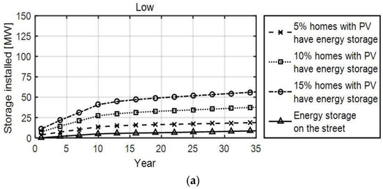 The capacity of storage installed both with storage randomly located in homes, and DNO installed storage, for (a) low; (b) medium; and (c) high PV penetrations.