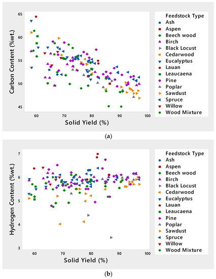 Before performing a regression analysis, it is required to examine the relationship between the variables. Figure 1 shows how the C, H and N contents of torrefied woody biomass vary with solid yield using scatter plots. From Figure 1a, it is observed that the carbon content decreases linearly with the increase of solid yield for every type of feedstock. Almost every type of wood forms a data cluster. Figure 1b indicates that the hydrogen percentage increases with increasing solid yield. As the amount of nitrogen is very low, its change is not significant. However, Figure 1c shows that the nitrogen content increases with an increase in the solid yield for some of the data of pine, willow and eucalyptus, but it decreases for other types of wood. Figure 2 depicts the HHV of torrefied wood versus the carbon and hydrogen yields. A linear relation between the heating value and the carbon content is evident in Figure 2a for all types of torrefied wood. However, no distinct relation between HHV and hydrogen content can be seen in Figure 2b.