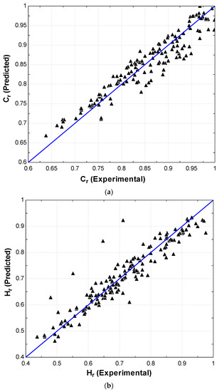 Figure 3 shows the deviation between the experimental and predicted values obtained from the regression models of Equations (14), (16) and (17) for, and, respectively. The predicted values that are in the close vicinity of the solid lines in Figure 3a–c imply a good accuracy of prediction by the model. The data points in Figure 3a show that they form a cluster at the upper region of the solid line. The maximum points of lie between 0.7 and 1. However, data for are distributed through the solid line as shown in Figure 3b with 96% of the data being in the range 0.5 to 1. On the other hand, for in Figure 3c, most of the data points are gathered in the upper region of the solid line like. All the data points of point lie between 0.65 and 1.