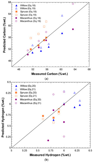 Figure 4 compares the predicted values of the carbon content, the hydrogen content, and heating value obtained from Equations (18)–(22) with the measured data reported in Refs. [48,49]. It is evident from Figure 4a that Equations (18) and (19) satisfactorily predict the C content. A maximum error of 7.23% is found for miscanthus when C is predicted by Equation (18). For woody biomass, a maximum error of 8.6% is found for spruce from Equation (19). In the case of H, as shown in Figure 4b, the largest difference between the predicted and measured values found for miscanthus is 12.33% when Equation (21) is used. Also, a reasonable accuracy of prediction is found for HHV in Figure 4c with a maximum error of 8.2%. Overall, the agreement between the predicted and measured values in Figure 4 is acceptable for engineering applications.