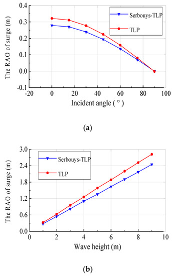 The working condition of A, B, C correspond to wave incidence angle, wave height and wave period, respectively. The effects of these three working conditions are respectively shown in Figure 7. As seen in Figure 7a, the surges of both Serbuoys-TLP and a typical TLP decrease as the incidence angle increases. For all the incidence angles, the surges of the Serbuoys-TLP are lower than those of the typical TLP. When examining the effect of wave height on the surge (see Figure 7b), both structures exhibit a rising tendency with the wave height. Similarly, the Serbuoys-TLP shows a good ability to suppress the surge over the typical one.