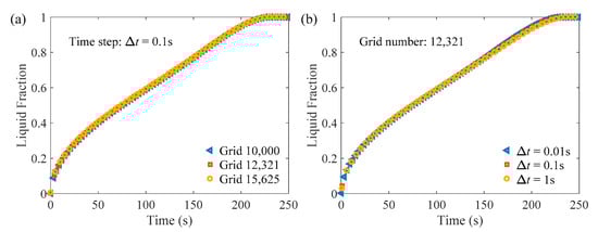 Figure 2 shows the grid and time-step independence validation of a square enclosure with a size of 10 × 10 mm2. The grid numbers, including 10,000, 12,321, and 15,625 cells, were tested to check the grid independence. The time steps, including 0.01, 0.1, and 1 s, were also tested. In Figure 2, it can be observed that further refinement in the grid size and time step did not apparently change the solution. The grid number of 12,321 and the time step of 0.1 s can satisfy the calculation accuracy.