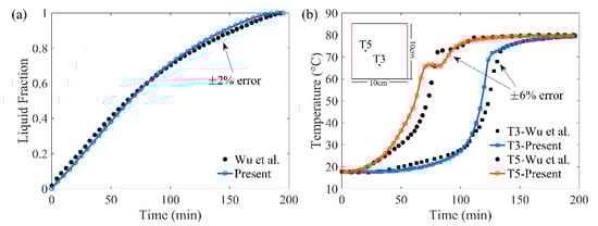 Validation of the present numerical model with the numerical and experimental data reported by Wu et al. []: (a) liquid fraction; (b) temperature profiles of T3 (x = 5 cm, y = 2.5 cm) and T5 (x = 2.5 cm, y = 5 cm).