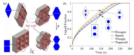 Figure 4a illustrates the two-dimensional sections of compositional triangular, trapezoidal, rectangular, and hexagonal cells with partly aluminum structure used to simulate the melting process of paraffin in Figure 4b. In Figure 4a, the hot wall is the vertically the front wall of the honeycomb structure, which is heated. Since the thermal conductivity of the aluminum structure is much larger than that of PCM, the PCM in the honeycomb core is mostly heated by the surrounding isothermal boundary. The simulated compositional cells in Figure 4b are selected from the slice of the honeycomb structure, which is far enough from the hot wall. Hence, the melting of PCM is dominated by isothermal boundaries rather than the hot wall.