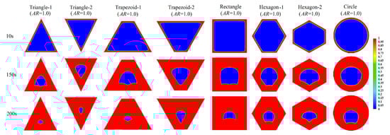 Liquid fractions of the triangular, trapezoidal, rectangular, hexagonal, and circular cells with smaller aspect ratios (AR = 0.5) at Ra = 3.095 × 105 (A = 100 mm2).