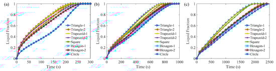 Temporal evolutions of the profiles of liquid fraction in the triangular, trapezoidal, square, hexagonal, and circular cells (AR = 1.0) at (a) Ra = 3.095 × 105; (b) Ra = 4.83 × 106; (c) Ra = 3.87 × 107.