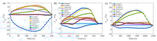 Enhancement ratios of energy absorption in the triangular, trapezoidal, square, hexagonal, and circular cells over time (AR = 0.5). (a) Ra = 3.095 × 105; (b) Ra = 4.83 × 106; (c) Ra = 3.87 × 107.
