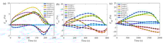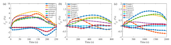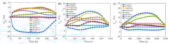 Figure 11 shows the enhancement ratios of the liquid fraction of PCM in all cells compared to the hexagon-1 cell at AR = 0.5. It is worth noting that the maximum value of enhancement ratios in Figure 11a is less than the maximum value in Figure 7a. It means that decreasing the aspect ratio of the hexagonal cell can significantly increase the melting rate of PCM in it, although it is not the optimal choice. In Figure 11b,c, it can be found that the melting rates of PCM in the triangle-2 cell decrease at the end of melting, which is much different from the results shown in Figure 7a,c. Because the above-mentioned low aspect ratio could suppress the natural convection of liquid PCM in the triangle-2 cell.