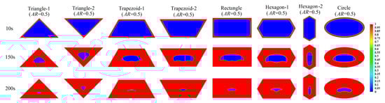 Besides the different cell shape and orientation, the aspect ratio of cells also influences the melting rate. Figure 9 shows the liquid fractions of the triangular, trapezoidal, rectangular, hexagonal, and circular cells with the smaller aspect ratios (AR = 0.5) for Ra = 3.095 × 105. The evolution of the melting process at other Rayleigh numbers may refer to the Appendix A. Compared to the case of AR = 1.0 in Figure 5, the liquid fractions are much larger for AR = 0.5 at 200, 770, and 2000 s.