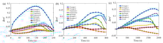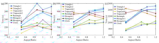 Figure 6 shows the temporal evolutions of the liquid fraction of PCM in five different cells when the aspect ratio is 1.0 and the Rayleigh numbers are 3.095 × 105, 4.83 × 106, and 3.87 × 107, respectively. It was found that the liquid fractions of PCM in triangle-1, trapezoid-1, and square cells are larger than that in a hexagonal cell at the same time. When the Rayleigh number is 3.87 × 107, this conclusion is much clearer (see Figure 6c).