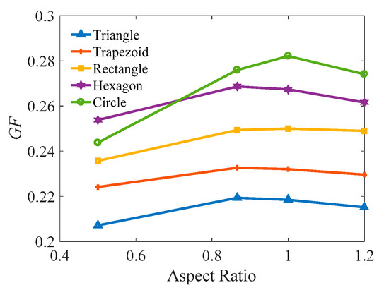 Figure 14 shows the distribution of the geometrical factor (GF) of triangular, quadrangular, hexagonal, and circular cells with different aspect ratios. The definition of GF is as follows: