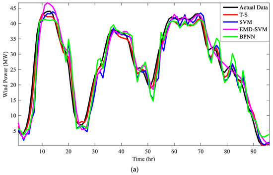 The forecasting results from the proposed model and other models were obtained as seen in Figure 5, where (a) is forecasting results for wind power, (b) and (c) are forecasting results for the wind speed from different wind farms. The curve from the T–S model is always closer to the curve of actual data, and can follow the actual data better in both cases. However, the performances of the other three models are different in different cases, indicating they are not as stable as the proposed model.