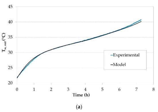 Figure 7 shows the performance of the tank water outlet temperature during a typical discharge (a) and charge (b) test. As can be observed, the model brings a good representation of the PCM tank thermal performance, especially during the phase change of the PCM. In the discharge mode, the maximum deviation obtained between the numerical and experimental values of the PCM TES tank water outlet temperature was of 1.2 °C. In the charge mode, a maximum deviation of 1.1 °C was obtained between numerical and experimental values of Tw,out. The maximum deviation was observed usually at the beginning and the end of the simulation, being the difference during the phase change smaller.