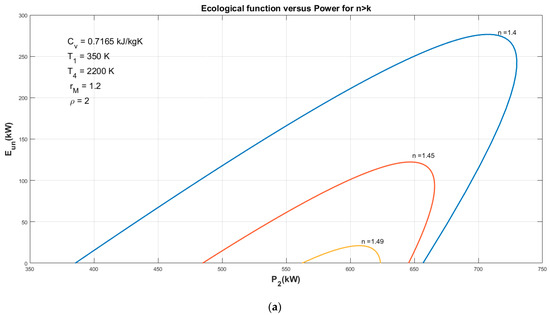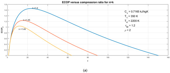 As shown in Figure 9a. As the compression ratio increases, with a very steep gradient, the ECOP first increases to its maximum point and then begins to decrease. In addition, in a constant compression, then ECOP decreases with the increase of the n (n > k). Figure 9b,c shows that the maximum value of the coefficient of performance for various n (n > k) will occur at almost the maximum power and maximum thermal efficiency.