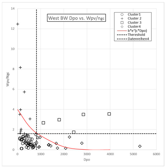 Figure 3 contrasts population density DPO to Wna (withdrawal of electricity per inhabitant) and finds a cumulation of DSO in the lower left area of the diagram. These are areas of low population density disposing of low withdrawal of electricity per inhabitant. The fact that inhabitants in little populated areas consume less electricity than in urban areas suggests that these areas could be less developed concerning grid infrastructure.