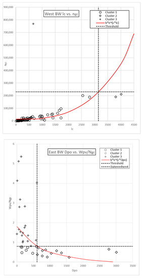 Gauss-Newton is now applied to classify networks according to in each half of the country for both parameter pairs ngc − lc as well as the − Dpo as follows. Areas outlined contain the critical networks of high population density and low peak power (upper charts) and high cable lengths and low number of interconnection points (lower charts). These are assumed to require remuneration.