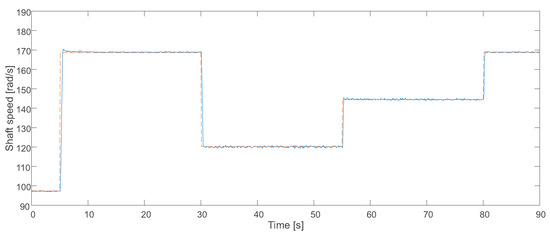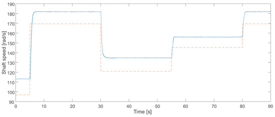The first experimental test corresponds to the feed forward controller on its own (blue line in Figure 13). The optimal shaft speed reference Ωopt is plotted in orange dashed line. Similarly to Case Study 1, even though the FF controller proves its capability to steer the system to the neighborhood of reference Ωopt, a remnant offset is clearly visible (approximately 15 rad/s in excess, corresponding to 17% at the lower speed), due to disturbances and model errors with respect to the real WECS-DWIG. Besides, in the zoomed view it can also be observed a noticeable settling-time (approximately 2 s) until steady state is reached.