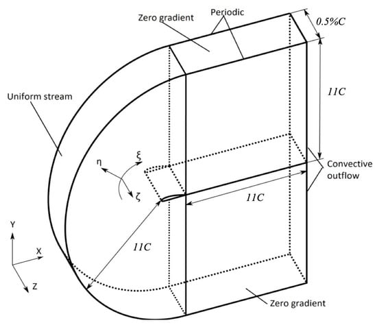 In order to validate our method, we conducted a LES of the compressible flow around NACA0012 airfoil with the computational setup matching the experimental setup of Miyazawa et al. [], in which the Mach number was , the angel of attack was , and the Reynolds number was , which was based on the uniform velocity in the streamwise direction and the chord length. Figure 2 shows the computational domain and computational boundary conditions in the present study. For the Cartesian coordinate system, x, z, and y were defined in the streamwise direction, spanwise direction, and vertical direction, respectively. We used a C-type boundary-fitted grid in the x–y plane. Thus, a general curvilinear coordinate system had to be applied and represented as , , for all computations, in which the direction following the mainstream surface of the airfoil is denoted as , the direction away from the surface of airfoil is defined as , and the spanwise direction is represented as . The computational domain size is defined as the following: the length of the wake, the semidiameter of the C-type grid, and the spanwise extent were , , and , respectively. Here, C is chord length. For the mesh, there were 1600 grid points in the direction, in which 800 was on the airfoil surface, 160 grid points were in the direction, and 60 grid points were in the direction. As shown in Figure 2, the non-slip boundary condition was applied on the airfoil surface. The inflow was the uniform stream without disturbance. The convective outflow was applied for the outflow boundary condition. The spanwise direction boundary condition is defined as the periodic. For the variables in the direction, zero gradient was employed at the op and bottom boundary. Particular attention was paid for the non-reflective boundary condition by [] at the far boundary.