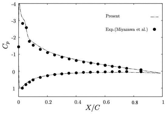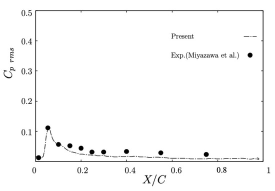 All simulations were computed on an NEC SX-8R supercomputer of Cybermedia Center, Osaka University with the time step . The greater part of the total effort toward calculations was spent on solving the pressure equation through the residual cutting method []. All simulations were run until the flow fields that were fully developed and the first-order, and second-order statistics exhibited adequate convergence. The time-averaging, and, the spatial averaging in the spanwise direction were used for collecting the data. Figure 3 and Figure 4 show the distribution of the mean pressure coefficient on the airfoil surface and the average pressure coefficient fluctuation on the suction side of the airfoil, in which is defined by the freestream pressure .