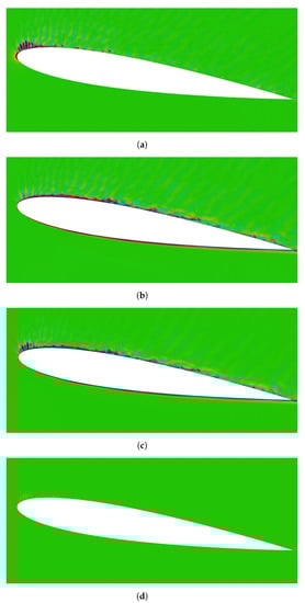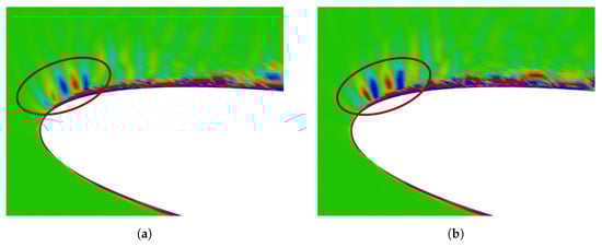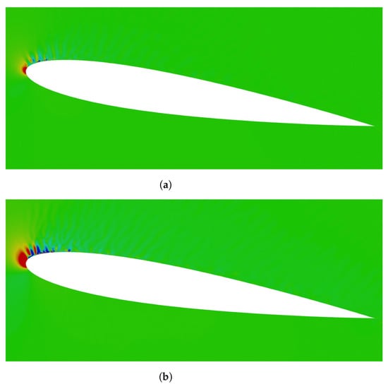 Figure 9 shows the instantaneous distribution of near the leading edge at Mach numbers and . The noticeable difference of the distribution for between Figure 9a,b was not observed in the immediate vicinity of the leading edge. However, in comparison with the case of , the clear patterns of were observed in the circle region in case of . From this observation, our acoustic theory was proven to be able to reproduce the influence of Mach number on the sound field.