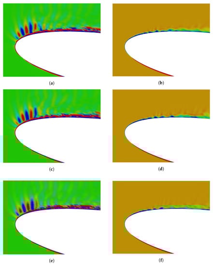 Overall, the SPL profiles by and the Lighthill–Curle’s method obtained by our LES do not agree well with the experimental data. However, the SPL profile obtained by the calculation of Miyazawa et al. [] does not agree with their experimental data either. The reason for the discrepancies between the experimental data and the results obtained by the numerical calculations may be lack of resolution in the simulation of the flow field, or the compact assumption that the sound source area is regarded as a point source in sound pressure prediction. Thus to verify our sound source model, we focused on comparing the SPL profile calculated from the Lighthill–Curle’s method which is widely used for sound pressure prediction, and the SPL profile obtained by our sound source model . Both SPL profiles were in reasonable agreement, especially in high-frequency regions. On the other hand, in both cases, the peak value existed at about 4300 Hz. This frequency is in good agreement with the period of the moving of positive and negative patterns near the leading edge in the suction side confirmed in Figure 5c. The computational cost to use as a sound source increases approximately against the Lighthill–Curle analogy, due to the volume integral required in our method, while the Lighthill–Curle formulation needs only surface integral. But our method enables the understanding of the relationship between the behavior of the sound source and the sound generation. Moreover, our method might be applicable to higher Mach numbers.