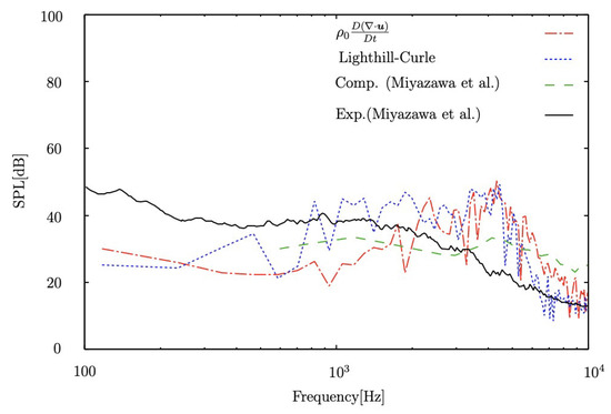 We compared sound pressure levels (SPL) for different acoustic models using our LES database and the published results from computation and measurement in the far-field; see Figure 7. The sound pressure in the far-field for our acoustic model was obtained by Equation (37) and converted to SPL by Equation (38). It is necessary to perform volume integration when determining the sound pressure in our sound source model. And the range of volume integration is determined by reference to the distribution of in Figure 5 and in consideration of the calculation costs. In Figure 7, the SPL profile calculated from the Lighthill–Curle’s equation [] employing our LES database was computed through following equation