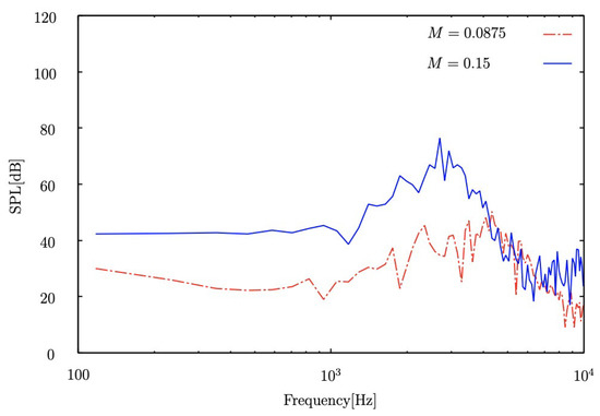 Figure 10 compares the SPL at Mach number and measured at point 1 m from the leading edge in the direction normal to the streamwise direction. Hutcheson et al. [] measured the aerodynamic noise generated from the flow field around the NACA0015 airfoil under the condition of the angle of attack , and the Mach number at , , and . Their investigation shows that the position of the peak frequency of SPL tends to move from the high-frequency region to the low-frequency region as the Mach number increases. In Figure 10, the maximum peak value obtained by is observed in a low frequency region, as it was against the profile of SPL obtained by . In other words, the tendency of SPL due to the increase of Mach number is reproduced by our sound source model.