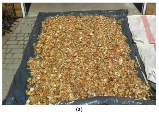 Pre-drying of the obtained post-production waste was carried out in atmospheric conditions by means of free convection. The collected raw material was loosely distributed in field conditions (Figure 1a). Pre-dried onion waste (Figure 1b) was ground to a particle size of approximately 5 mm and smaller (Figure 1c) using a “Bąk” H-111 flail shredder equipped with 5 mm sieves.
