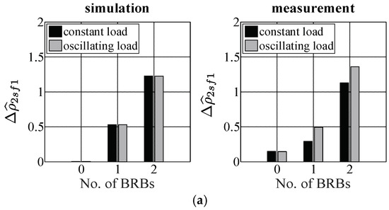 It can be concluded that the Δρ amplitude of the 2sf1 component () serves as a robust fault indicator, regardless of the parameter accuracy in the monitoring system and the oscillations of load torque: in a healthy motor, this amplitude will be small (almost 0), while it is expected to be significantly higher with a damaged rotor. This fact enables the unambiguous detection of BRB even in the dubious cases reported in [26].