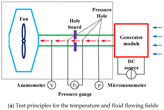 The test principles and built test bench is as shown in Figure 9. The actual heat transfer processing of the generator is described as follows: Firstly, a fan is used to evacuate the air in the stator yoke back area, so this area will be a negative pressure area as the fan operates, the cooling air will come into the generator module by through the wind tube, as shown in Figure 9a. A hole board is set in the wind tube to get the pressure drop, the pressure difference ΔP is determined by the orifice flowmeter located on both sides of the hole board, and the flow coefficient of the orifice plate and the wind speed is measured by using the anemometer. So, the air volume going into the generator can be calculated using the pressure drop, wind speed, and orifice flow coefficient. The micro-pressure gauge close to the test model is used to measure the outlet static pressure value. The pressure difference between the static pressure value and the atmosphere is the ventilation pressure drop of the model. The temperature of the windings is measured by a temperature measuring element embedded in the interior of the model. The actual cooling system test bench is built as shown in Figure 9b.