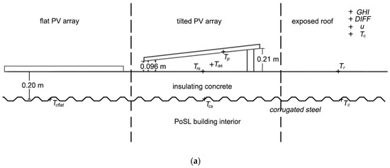 (a) Schematic diagram; (b) interior ceiling surface temperatures under exposed roof, tilted PV array, and flat PV array. Reprint with permission from Reference [56]; 2011, Elsevier.