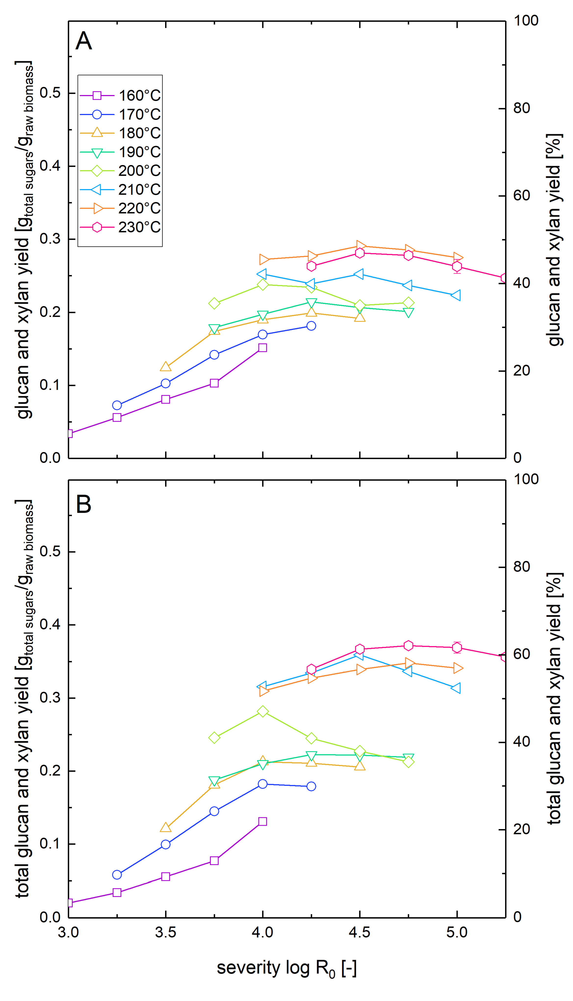 3.4. Total Sugar Yields after Steam Explosion Pretreatment and Enzymatic Hydrolysis at Low Solid Loading