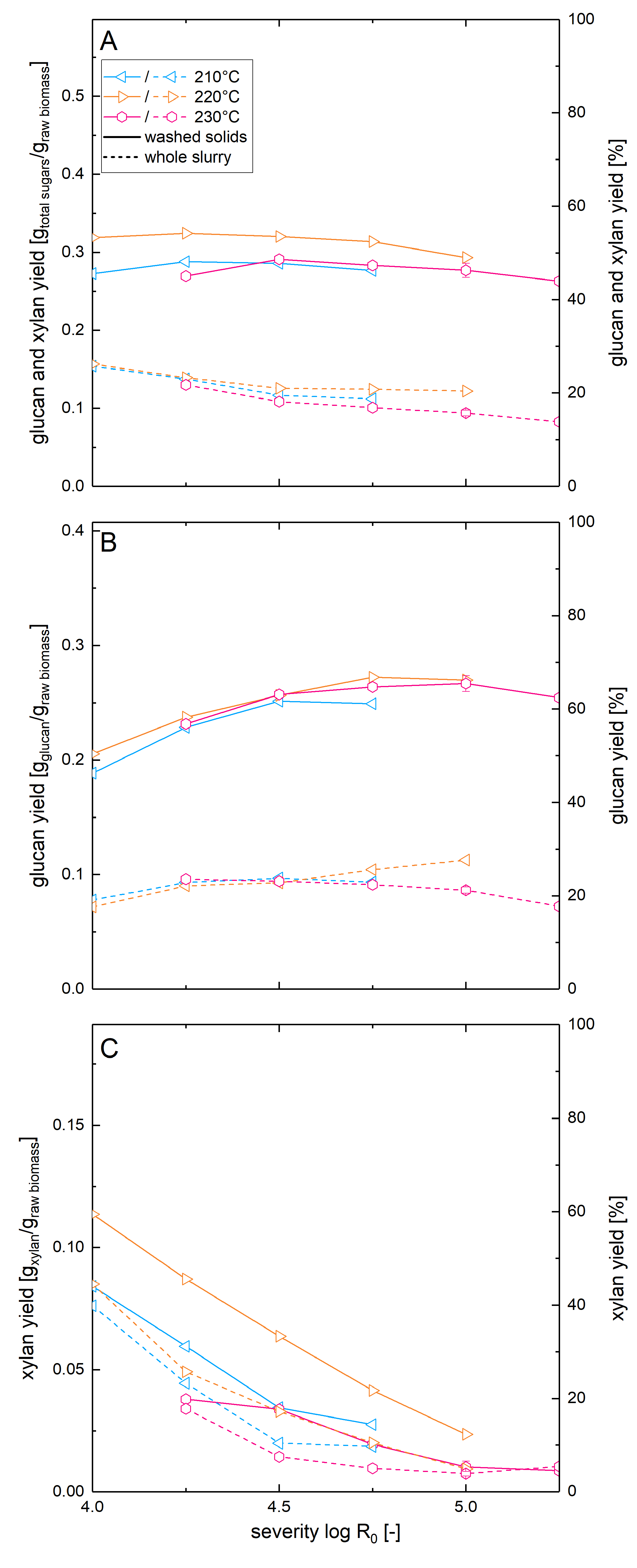| Sugar, Glucan Concentration in Enzymatic Hydrolysis | Yield (%) | Optimal Pretreatment Conditions (log R0, T [°C]) | Yield (%) | Optimal Pretreatment Conditions (log R0, T [°C]) |