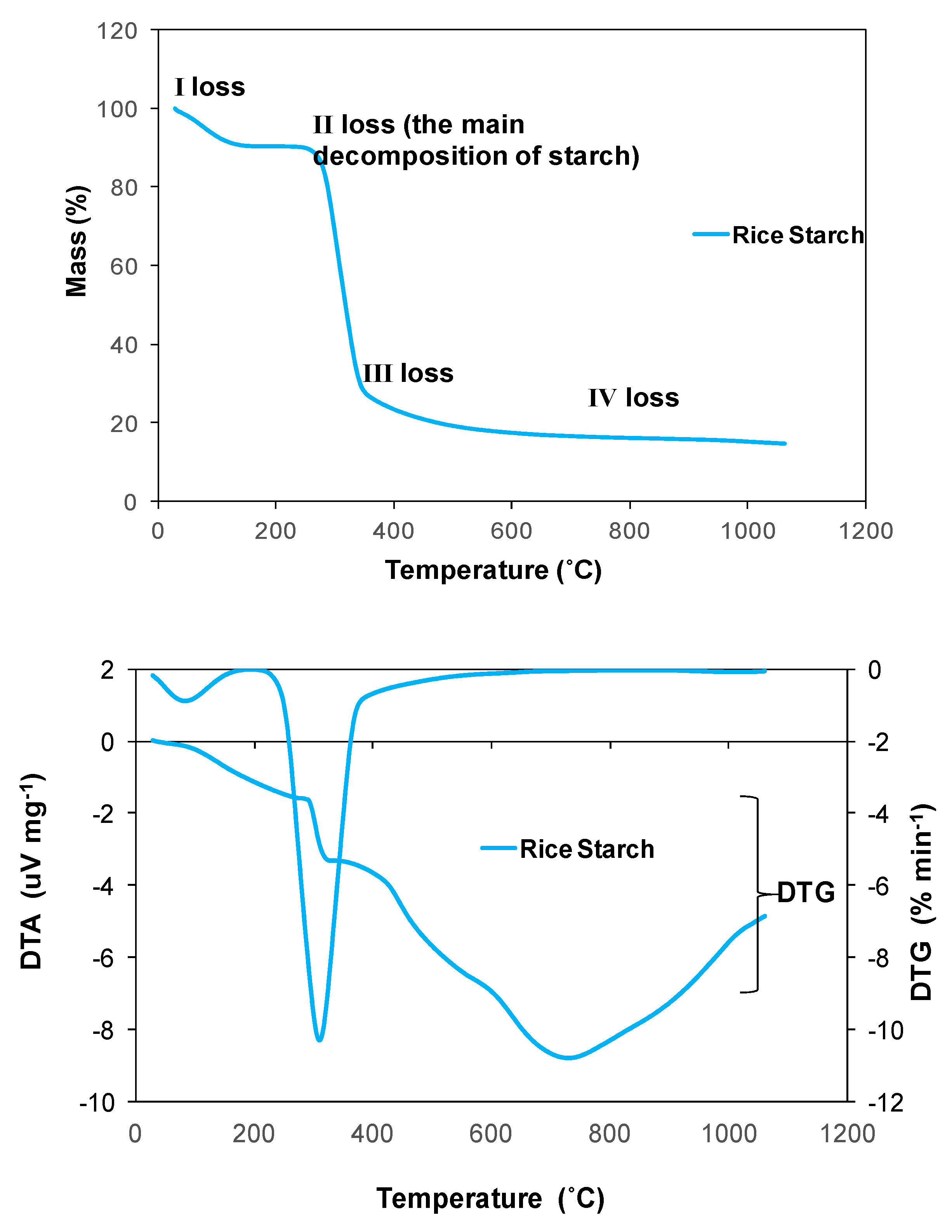- Pigłowska, M.; Kurc, B.; Rymaniak, Ł.; Lijewski, P.; Fuć, P. Kinetics and Thermodynamics of Thermal Degradation of Different Starches and Estimation the OH Group and H2O Content on the Surface by TG/DTG-DTA. Polymers 2020, 12, 357. [Google Scholar] [CrossRef]