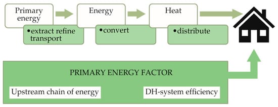 Directive 2018/2002/EU (indent 21) states the importance of considering all the steps in the energy chain while calculating the energy savings in order to multiply the potential of savings in electricity transmission and distribution []. The Primary Energy Factor (PEF), described also as the conversion factor, helps to evaluate the primary energy consumption, including the chain of energy generation based on the final energy consumption data (Figure 1). It shows the amount of primary energy used to produce a unit of electricity or, in specific situations, the unitary useable thermal energy.