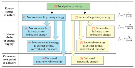 The total primary energy factor may be calculated using the Equation (1) according to the regulations of EN 15603: 2014 [].
