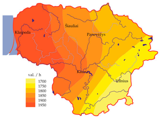 The average annual solar radiation impinging onto the horizontal surface of Lithuania reaches approximately 1000 kWh/m2. Sunlight lasts the longest in the western part (1840–1900 h/year) and shortens while moving towards the east (1700 h/year) (Figure 3).