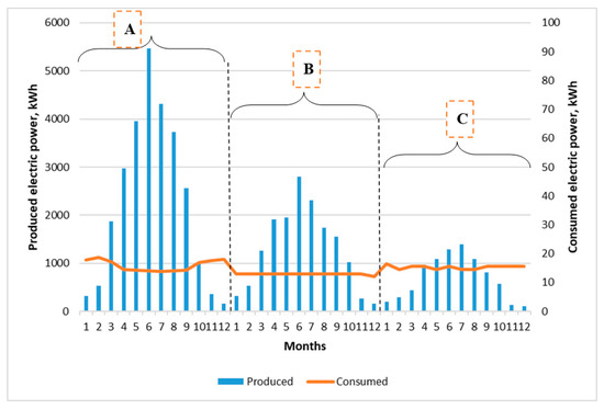 In order to determine the PEF, first of all the overall balance of the generated and consumed electric power in the analyzed PV systems was investigated. The results of the analysis of the average monthly distribution of the produced and consumed electric power in A, B, and C groups of the studied PV systems are presented in Figure 4.