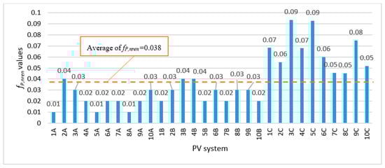 As was mentioned before, the PEF or fP,tot (they are the same) values consist of photovoltaic renewable (ƒP,ren) and non-renewable (ƒP,nren) primary factors. The renewable primary energy factor ƒP,ren is equal to 1, according to the directive []. Hence, the non-renewable primary energy factor fP,nren was determined after the assignment of analyzed PV systems to groups of different capacities (A, B, and C). The results of the calculated fP,nren factors of the studied PV systems are presented in Figure 6.