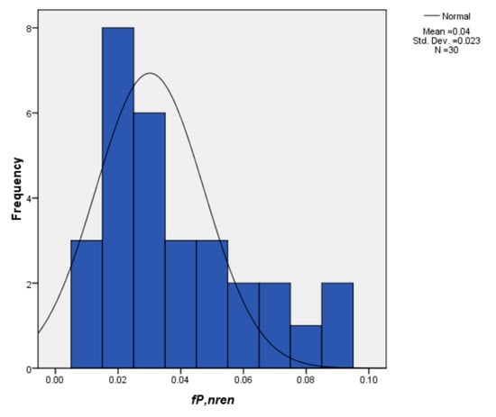 The frequency distribution (Figure 7) meets a normal Gauss distribution, but it is slightly shifted to the left side. This result shows that the values of fP,nren for C group (capacity is less than 10 (kW)) is bigger 32–43% compared with the A and B groups.