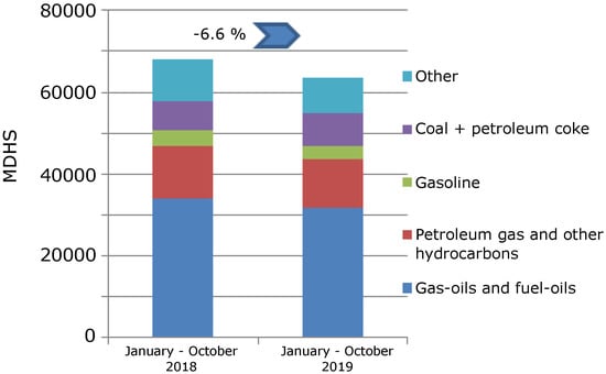 The relevant increase in energy demand and its effects on the environment have led countries to promote actions and programs in order to mitigate these negative environmental, economic and energy dependence effects. These countries have also developed national legislative frameworks to regulate efficient and renewable energy scenarios according to the different sectors and their energy requirements. Among the different sectors, end-use energy consumption in buildings globally increased from 2820 millions of tons of oil equivalent (Mtoe) in 2010 to 3060 Mtoe in 2018 []. Buildings’ energy consumption accounts for approximately 40% of global energy consumption, mainly demanded by heating, ventilation and air conditioning (HVAC) systems []. However, the fossil fuel proportion only decreased slightly from 38% in 2010 to 36% in 2018. Indeed, oil use still accounts for 63% of Morocco’s residential energy consumption. This percentage is exceptionally high in comparison with that of most IEA countries, with an IEA average of 13% oil use []. Under this scenario, some authors also highlight the importance of the energy poverty concept in current European countries, mainly due to poor energy performance of buildings and high energy costs []. Kephalopoulos et al. [] affirmed that energy poverty is a common issue in social housing, mainly in Southern European countries, due to the low income level of their inhabitants. These countries have more favorable climatic conditions, but commonly present poorer building insulation, less efficient thermal equipment, and, with regard to the average user, a lack of energy-efficient habits. Added to this is the fact that around 50 million Europeans live in energy poverty conditions, with inefficient homes and, consequently, high energy bills to maintain minimum comfort levels []. This high energy dependence and poverty condition situations can be also found in areas near Europe, such as Morocco []. Indeed, the European Union (EU) addressed a relevant review of its Mediterranean neighborhood policy to improve its efficiency and reinforce its ambition and financing. The EU institutional relationships with the Middle East and North African countries (MENA) are currently defined by the European Neighbourhood Policy (ENP). Among the MENA countries, Turkey and Morocco are currently the countries with deeper relations with the EU []. As far as the Human Development Index is concerned, Morocco’s Human Development Index (HDI) in 2014 was 0.628, which classified the country in the medium human development category and ranked it 126th (shared with Namibia) out of 188 countries []. The gross domestic product (GDP) per capita was 3.190 in 2014 (in US$). Currently, Morocco receives an estimated score of 0.50 on the World Bank’s HDI. The country is ranked 98th out of 157 countries, with a lower HCI score than the MENA average region but a higher score than the average for other countries in its income classification [,]. The Sustainable Development Goals (SDGs) included in the 2030 Agenda propose a commitment to promote sustainable consumption and reduce inequalities within and among countries []. In [], the incorporation of inclusive and sustainable industrialization, as well as infrastructure, into the SDGs is a significant achievement for countries of the global South. Nevertheless, and by considering previous aspects, it can be affirmed that Morocco is totally dependent on energy source imports, mainly fossil fuels, with significant repercussions in terms of national energy security and the economy []. To mitigate this energy dependence, Morocco has decreased its fossil fuel imports from 95% during the last decades to lower percentages in 2017: oil accounted for 62% of the total primary energy supply, and coal and natural gas accounted for 22% and 5%, respectively. In 2017, the global imported primary energy mounted to 69.5 billion dirhams (7.3 billion dollars) []. In October 2019, the value of primary imported energy decreased 6.6% compared with the same period in 2018 []. Figure 1 shows this evolution of the energy dependence (2018–2019) in millions of dirhams (MDHS); 1 million dirhams is equivalent to almost 100,000 euro. Energy consumption in buildings in Morocco represents 33.6% of the total, with the residential sector accounting for 25.4% and the tertiary sector accounting for 8.2%. The building sector has the second highest energy consuming sector in Morocco, after the transport sector, which accounts for 38% [] (see Figure 2).