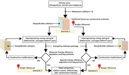 The proposed methodology aims to compare a traditional reference residential building located in Tangier (Morocco) in terms of thermal behavior and cooling/heating energy demand according to the current Spanish and Moroccan legislations. This residential building was thus initially designed following the traditional constructive materials in Morocco, and subsequently adapted in line with the new Moroccan thermal regulations described in Section 2.1. The initial design was also compared to the Spanish legislation as an attempt to meet such requirements in terms of maximum energy demand consumption. Therefore, the estimation of annual energy needs of the reference building (in kWh/m year) under the different scenarios was proposed and evaluated. Figure 5 shows the general overview of the proposed methodology and the software packages used by the authors, identifying the simulations cases: (i) Scenario 1: reference residential building designed from traditional Moroccan constructive materials; (ii) Scenario 2: reference residential building adapted to the new Moroccan legislation; (iii) Scenario 3: reference residential building adapted to the Spanish annual energy demand requirements.