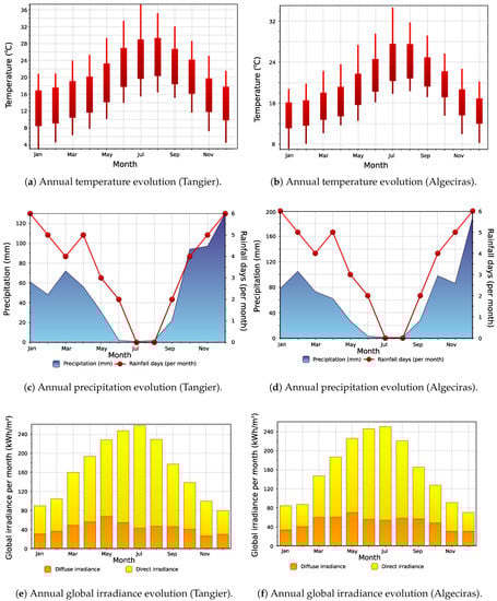 A comparison to nearby countries was justified due to the similar meteorological conditions between both regions. In fact, and according to the climatic zones presented in Section 3.1, Tangier (Morocco, climate zone Z2) has meteorological conditions similar to those of the Spanish climatic zone A3—for example, the city of Algeciras (Spain). Figure 6 compares such Mediterranean areas by considering annual meteorological data. Outdoor temperature data also include monthly extremes and interquartile ranges. According to the proposed methodology, meteorological data for two locations—Tangier (Morocco) and Algeciras (Spain)—were obtained through the Meteonorm software 7.0 (Meteotest AG, Fabrikstrasse 14, 3012 Bern, Schweiz) [] to compare both locations [], in line with the climate zone definition methodology proposed by Walsh et al. in []. This software package was widely used to generate averaged meteorological data, such as incident solar irradiation and ambient temperature. A recent example focused on different Moroccan climate zones—Ben Guerir, Agadir and Tangier—can be found in [].