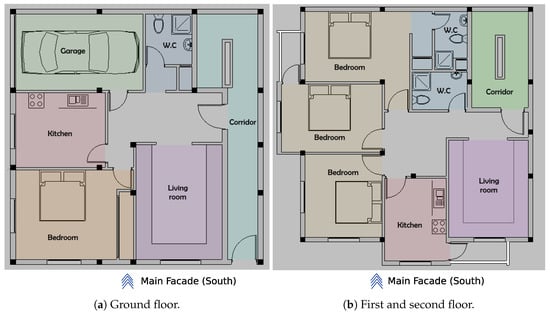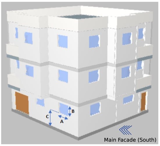 A reference residential building case example was designed. This reference building consisted of a ground floor and two stories, considering typical apartment layouts. The main façade was oriented to the South. The height of each story was 3 m.On the ground floor was the main entrance, an area for retail space and the garage. The ground floor apartment consisted of a living room, a kitchen and one bedroom with a total surface area of 83.4 m. The first and second floors presented similar distributions with three bedrooms and a total surface area of 100 m for each floor. Distribution and general overview are depicted in Figure 7. The reference building was found in the Moroccan climate zone Z2; see Figure 4. The urban context was not included in this case example. Nevertheless, and in linewith [], simulation in an urban context has a negative impact on the thermal energy demand, since higher values of the demand are usually obtained—i.e., an increment in kWh/m.