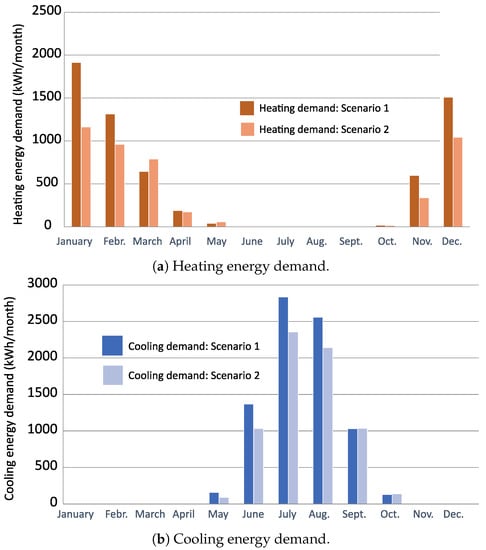 Heating/cooling energy demand, Tangier (Morocco)—Scenario 1.