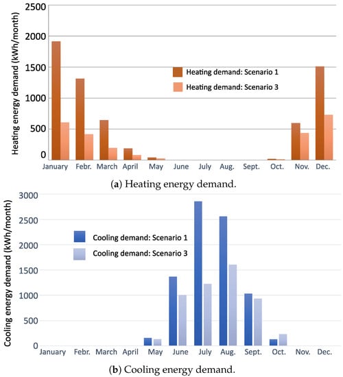 Heating/cooling energy demand. Reference residential building—Scenario 3.
