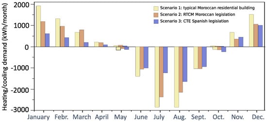 According to the results obtained, and only considering energy efficiency data at the building envelope level, the Spanish regulation saves more energy than the Moroccan RTCM norms—specifically, 45.4%, compared to 17.9% for the case of Morocco norms. Table 9 compares and summarizes these results. A difference in monthly energy demand for heating and cooling energy demand was then determined for the entire year between both reference residential buildings. A comparison according to the current building regulations, RTCM requirements and CTE requirements, is shown in Figure 12, where the energy demand for heating is represented by positive values and the cooling energy demand is represented by negative values. Heating and cooling energy consumption for currently typical Moroccan residential buildings were also determined and included, labeled as Scenario 1. As was previously discussed, these typical constructions demand more energy and they are not in line with the new Moroccan thermal building legislation. In fact, M’lahfi et al. affirmed that compliance with the RTCM requirements in the Morocco housing sector would allow us a final energy savings of around 22 kWh/m year and a significant  reduction, depending on each climatic zone [].